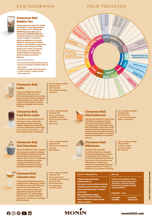 Wielofunkcyjność – Niezależnie od tego, czy wykorzystasz produkt w kawiarni, na barze czy restauracji, syrop MONIN Cinnamon Roll doskonale sprawdzi się w różnorodnych napojach. Od tradycyjnych kaw po mrożone frappés i napoje typu milkshake. Świetnie komponuje się także z ciemnymi alkoholami i produktami jabłkowymi, takimi jak cydr lub calvados.